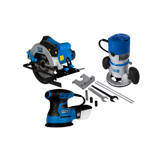 COMBO SIERRA CIRCULAR 7 1/4 1.550W + LIJADORA ROTO ORBITAL 350W + RUTEADORA 1500W