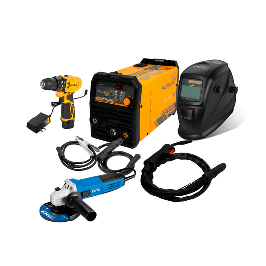 COMBO SOLDADOR INVERSOR MULTIPROPOSITO + CARETA FOTOSENSIBLE + TALADRO INALAMBRICO 3/8PUL + ESMERILADORA ANGULAR 4 1/2