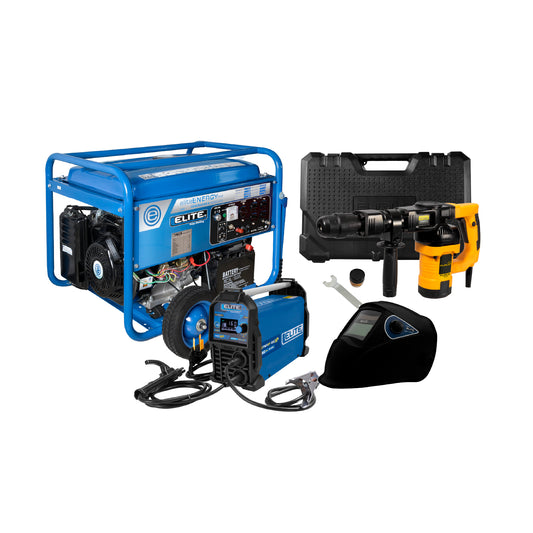 COMBO GENERADOR PORTATIL GASOLINA 6.5KW + SOLDADOR INVERSOR + MARTILLO DEMOLEDOR SDS MAX 1300W + CARETA SOLDADURA ELECTRONICA