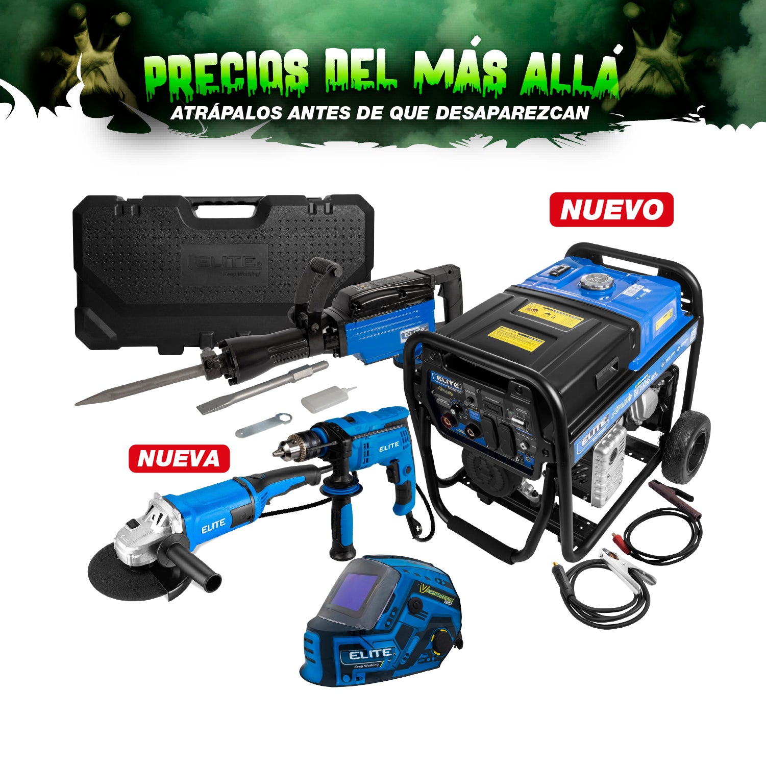 COMBO MOTOSOLDADOR GASOLINA 4T + CARETA ELECTRONICA SOLDADURA + ESMERILADORA ANGULAR DE 9 + TALADRO PERCUTOR 1/2PUL + MARTILLO DEMOLEDOR HEX30