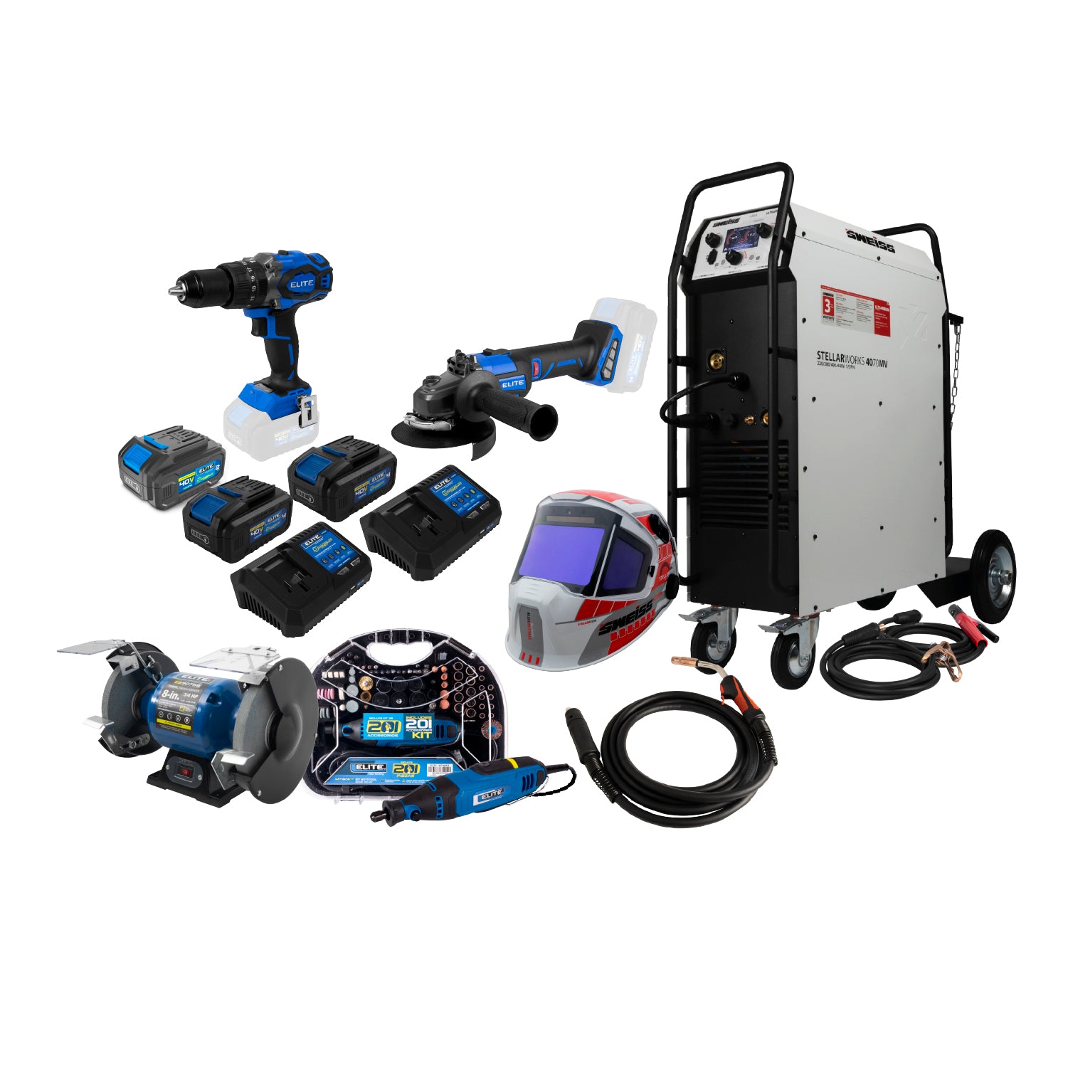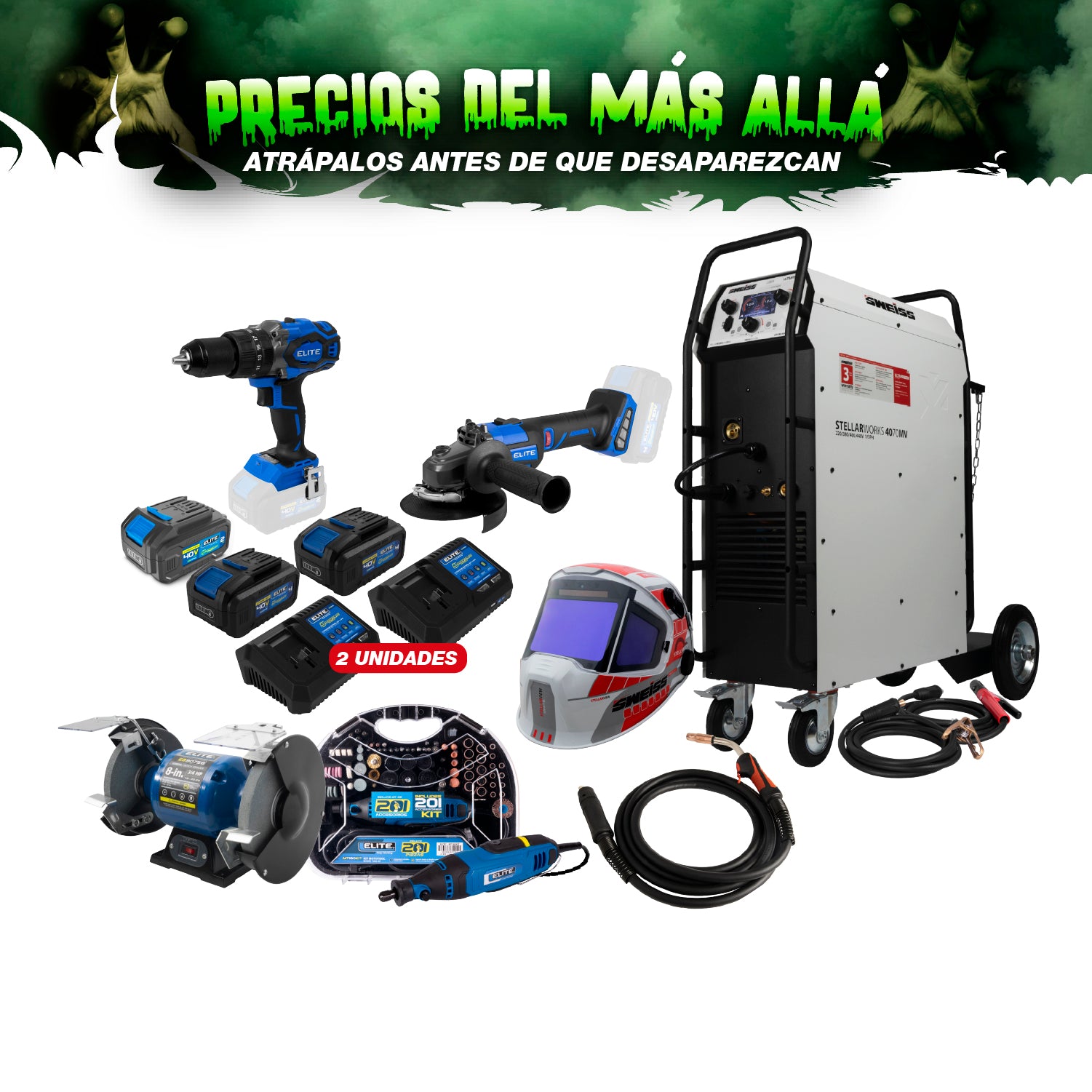 COMBO SOLDADOR + ANTORCHA + CARETA + ESMERILADORA + 2 CARGADORES + 3 BATERIAS + TALADRO PERCUTOR + ESMERIL + MOTO TOOL