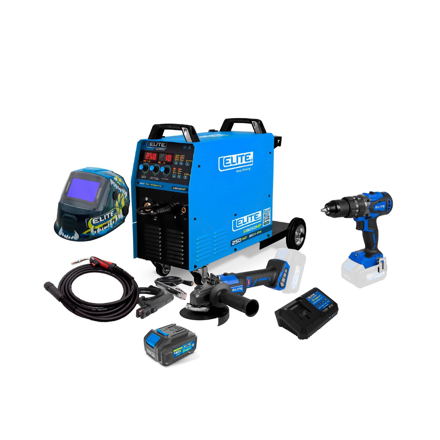 COMBO SOLDADOR INVERSOR + ANTORCHA + CARETA ELECTRONICA + TALADRO PERCUTOR INALAMBRICO + ESMERILADORA INALAMBRICA + BATERIA + CARGADOR DE BATERIA